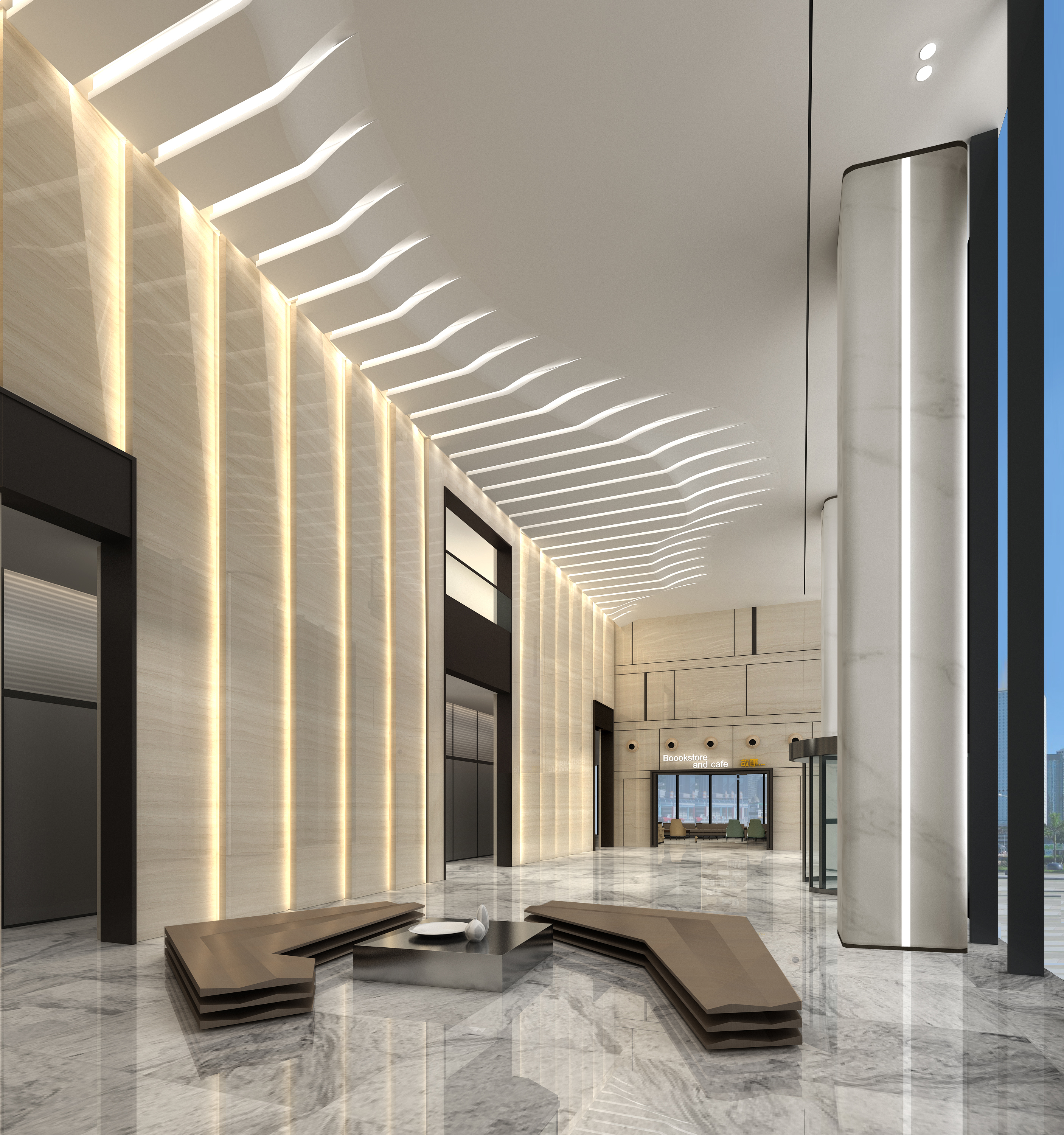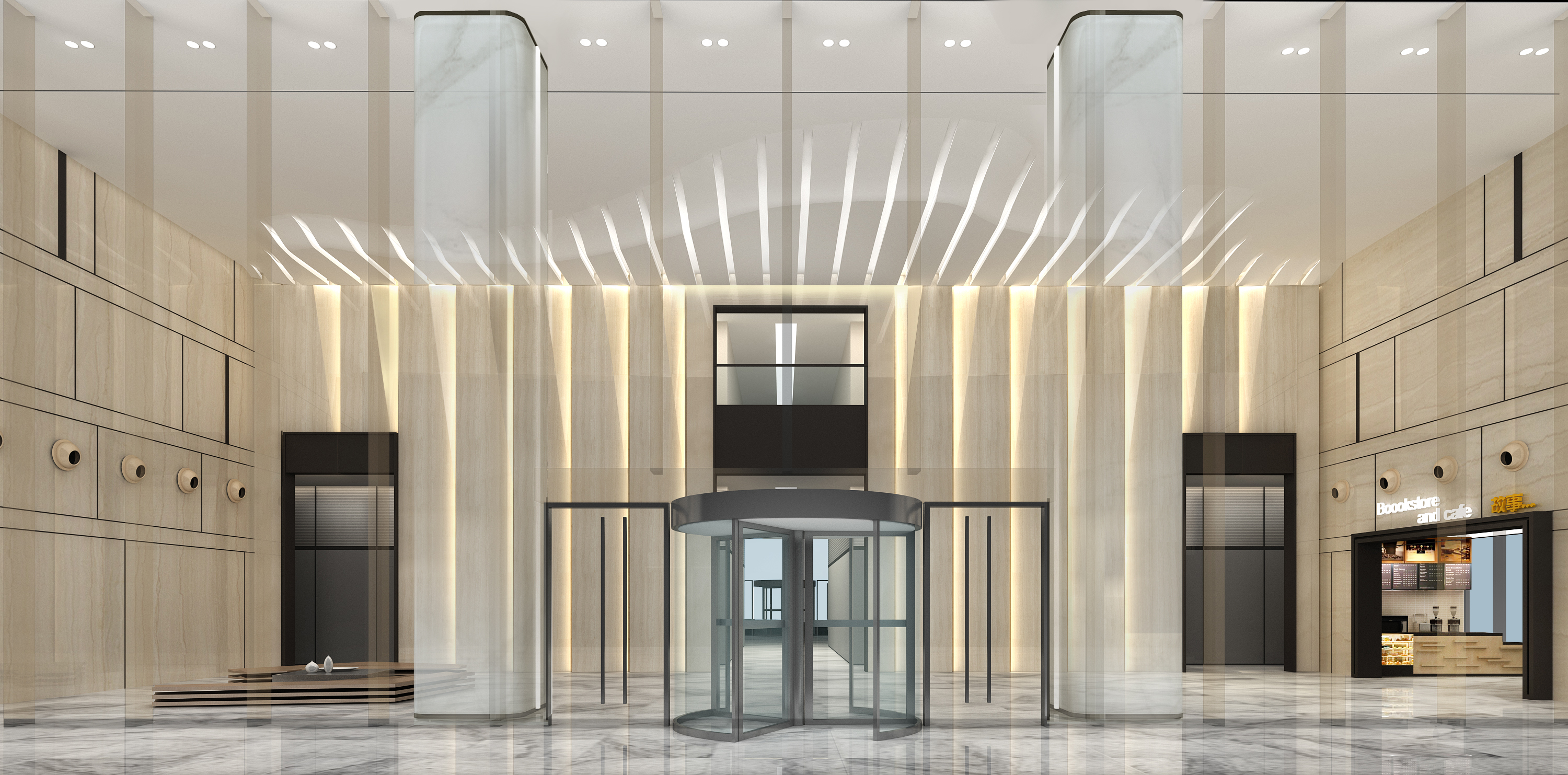 昆山创业园大厦坐落于昆山经济技术开发区最为繁华的街道长江路与创业路交口,大楼整体布局结构为地下三层地上二十四层,功能范围涉及商用、办公、休闲、娱乐等。这已然成就一个“小城镇,”为保持良好的工作状态和交流环境,营造一个健康的社区就变的尤为重要。 设计围绕“城中之城、健康园区”的理念进行延伸,从整个建筑外观来看,线条感层次丰富,富有时尚气息,为保持室内、外环境的融会贯通,设计手法上巧妙地将室外线条引入在室内然后加以细化处理,让来到这里办公的人们有一种焕然一新的感觉,并且在材质的利用上也多采用木纹色、米色、灰色为主题色,深灰色为辅助色的主题思想,摒弃传统写字楼的封闭气息,采用全开放和半开放的楼层空间格局和热闹的往来人流,无不让人感觉到轻松和神往。 根据其使用功能及项目规划,我们将其定位为高效创新,温雅庄重,具备国际时尚感的现代化写字楼。为了营造一个符合符合并具有:“创新、高效、时尚、温雅”特色的室内空间环境,设计团队对建筑物本身被赋予的具有意义的功能、空间等进行了分析,通过建筑与环境中提取的概念元素进行思考、衍变和重组进而运用到各个室内空间单元使之建立起联系,运用空间类型的多样化、空间的分割方式、空间的艺术处理手段、空间感的调节以及空间规划等方法,使整个室内空间形成主次分明、井然有序、层次丰富的整体。 水的形态有着不可比拟的动态美感。自然、流畅,这种富有变化美感的线条经过我们设计手法的分解和重组后,渗透到整个办公环境中,使整个办公环境的框架、结构、空间和色彩显示多元复合的设计,将简约与唯美、明晰与朦胧、真实与虚幻的具有多维互补的设计语言----消解、重构,在多元复合的结构中建构富有创意的视觉空间。