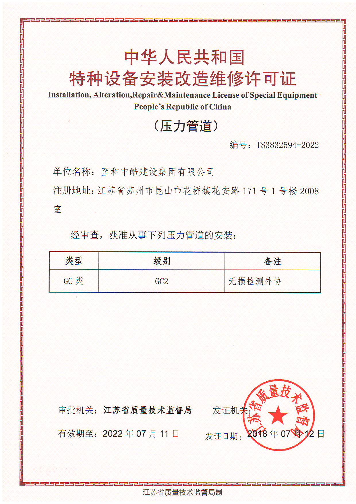 【至和中皓】荣获GC2级压力容器、压力管道安装许可证